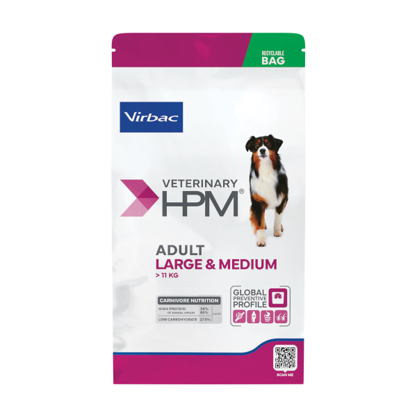 Virbac Adult Large & Medium Köpek ve diğer boyutları, orta (10–25 kg) ve büyük (25 kg üzeri) yetişkin köpekler için Veterinary HPM® formülüyle hazırlanmış kuru köpek mamasıdır.